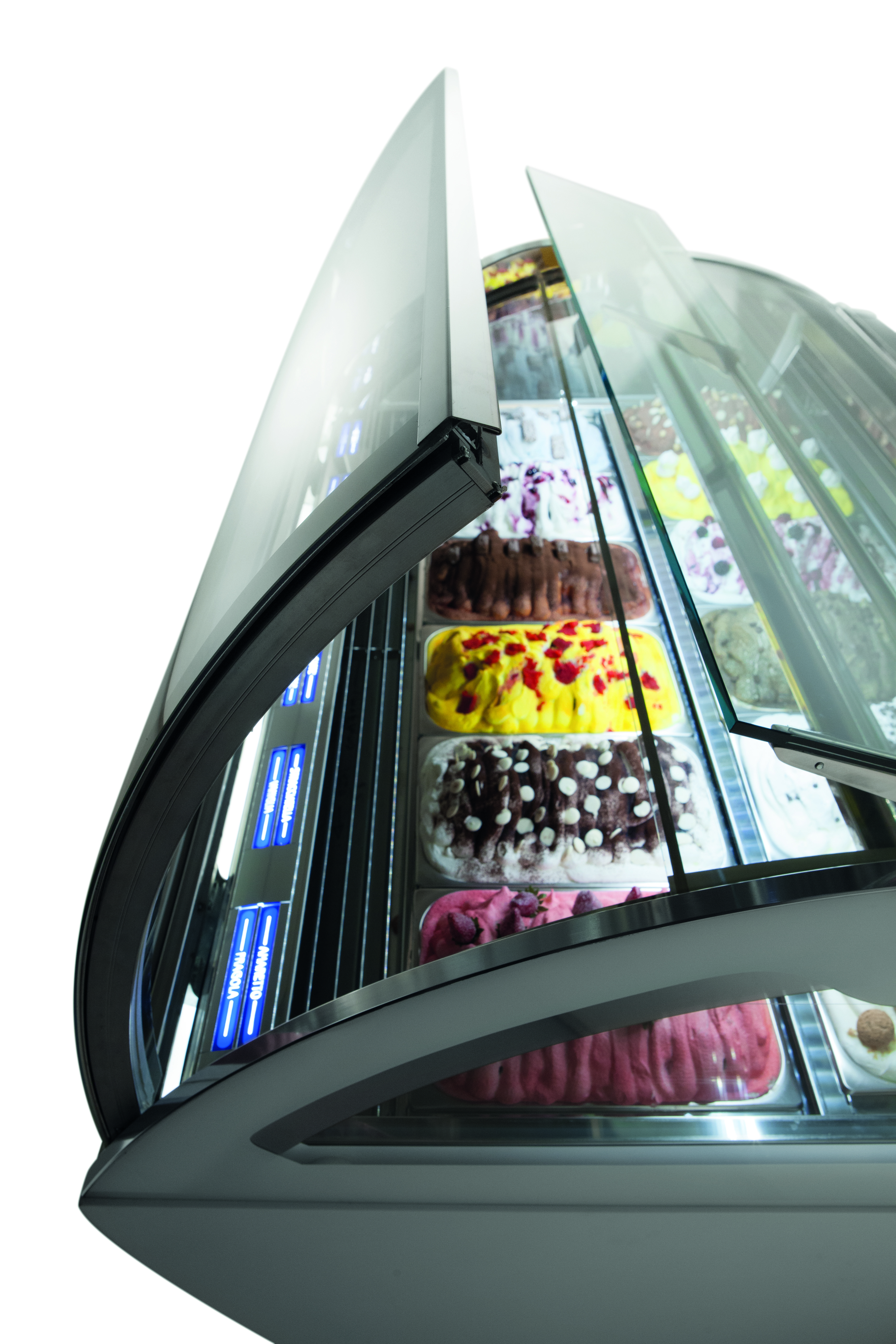 - Povrch výstavnej plochy vám umožňuje zobrazovať vašu zmrzlinu nad okrajom nádoby (vysoká zmrzlina), takéto použitie je možné vďaka osobitnému tvaru vaničky, so širokým uvoľňovaním vzduchu (3 nastaviteľné deflektory) a širokou plochou na zhromažďovanie vzduchu..